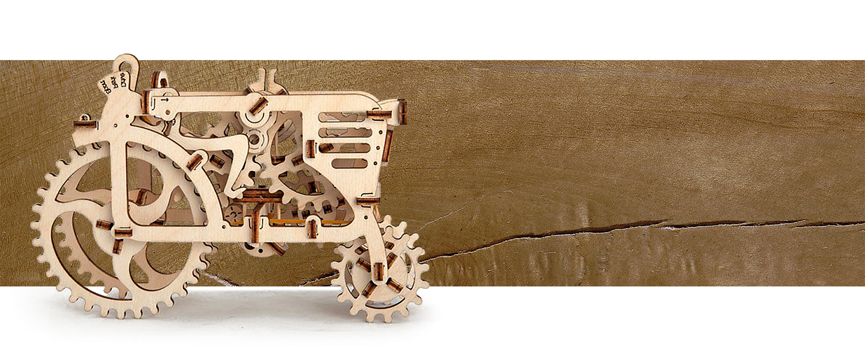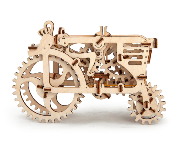 В коробке вы найдёте множество деталей и оси для того, чтобы эти комплектующие скреплять друг с другом. Кроме них вам не понадобится ни клей, ни инструменты, чтобы создать свой маленький деревянный трактор |