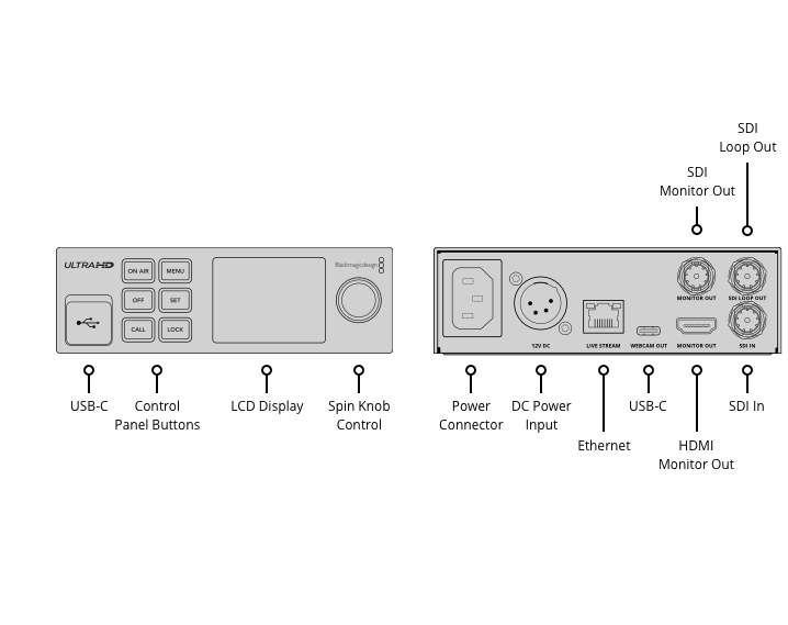 Устройство оснащено разъёмами USB, которые позволяют подключать компьютер и использовать приложения для потоковой трансляции, а также Skype или Zoom. Сигнал можно выводить не только по Ethernet, но и через 5G- или 4G-телефон в качестве мобильной точки доступа. Кроме того, предусмотрен выход для контроля параметров SDI-потока, чтобы просматривать изображение, индикаторы звука, графики и технические данные |