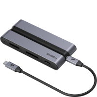 Мультимедийный хаб с подключением к двойному порту Type-C на MacBook. Устройство имеет два порта HDMI 4K/60Гц, сквозной зарядный порт PD Type-C на 60 Вт, а также интерфейс для карт памяти формата SD и microSD. Флеш-накопители или аксессуары можно подключить посредством двух USB со скоростью передачи до 5 Гб/с