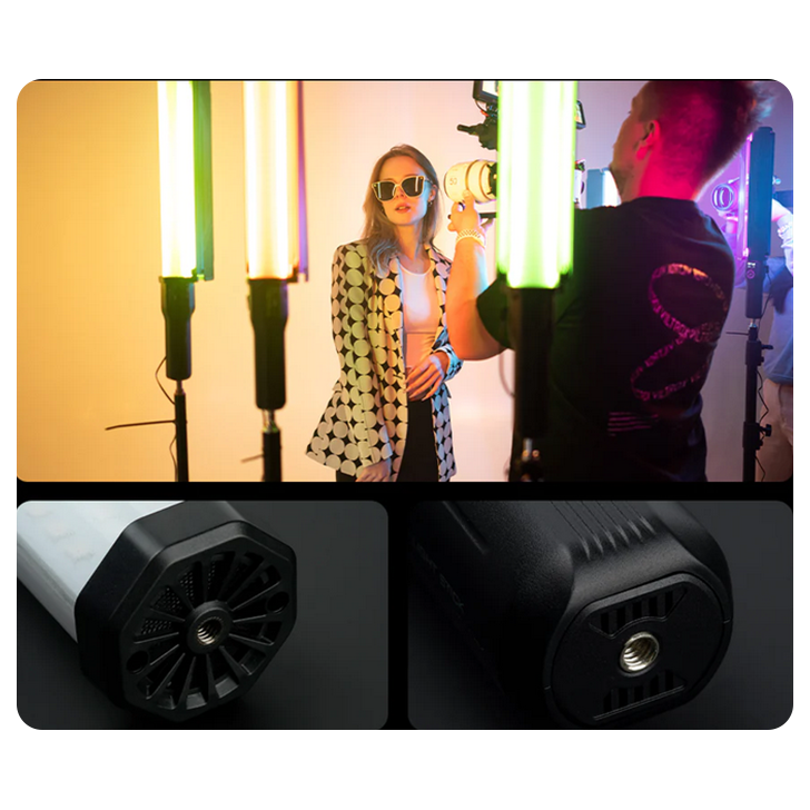 Автономная работаВ рукоятке осветителя спрятана батарея, что способна обеспечить до 110 минут работы. Также предусмотрен порт DC 5.5/2.5мм для работы от сети. В верхней и нижней части имеется крепление 1/4" для установки на треногу или иное крепление |