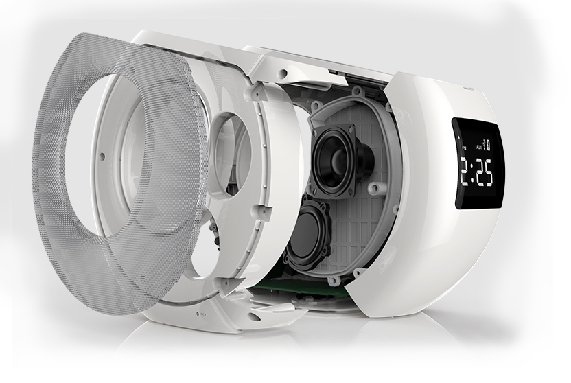 Основу устройства составляет состоящая из двух каналов (динамиков), мощностью по 10 Ватт каждый, отвечающих за разный диапазон частот, благодаря чему звук получается объемный и насыщенный, с хорошими басами и четкими "верхами». Усилитель от Texas Instruments делает звук громче не в ущерб качеству, а технология APT-X позволяет передавать по Bluetooth высокое качество аудио, сравнимое с воспроизведением CD. Источник можно подключить как по Bluetooth, так и через стандартный вход Aux, расположенный на тыльной стороне
