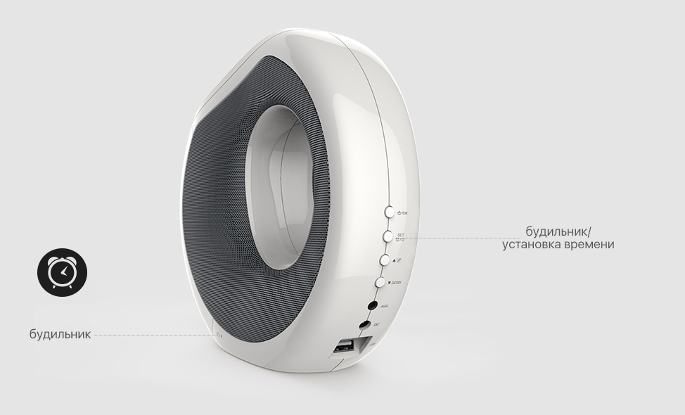 Функции: Bluetooth воспроизведение, ответ на звонки, ,беспроводная зарядка, будильник, Aux воспроизведение, NFC сопряжение, USB зарядка