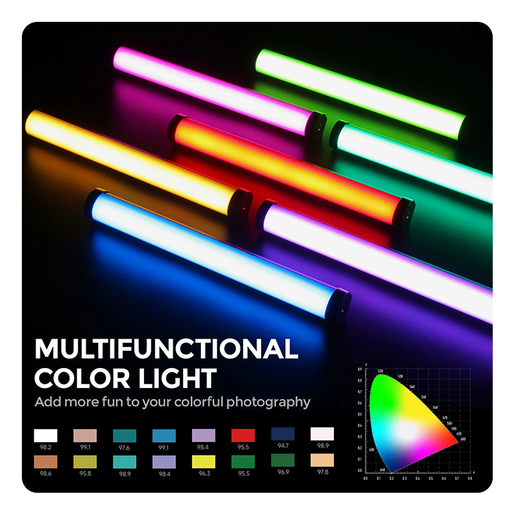 Профессиональный контроль света и цветаRGB жезл модели B320S оснащен 180 светодиодами с индексом цветопередачи CRI >95+, обеспечивая естественную и точную передачу оттенков. Яркость достигает 1200 люкс при 0.5м, а регулируемая цветовая температура от 2500K до 9900K охватывает весь спектр от теплого до холодного света. Точная настройка цветового тона в диапазоне 0°–360° и плавное изменение яркости от 1% до 100% позволяют создавать любые световые сценарии |