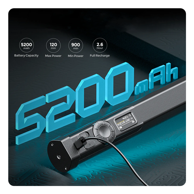 Энергоэффективность и функциональностьВстроенный аккумулятор емкостью 5200 мАч поддерживает до 120 минут работы на максимальной яркости и до 900 минут на минимальной, а заряжается батарея через порт Type-C. OLED-дисплей обеспечивает визуальный контроль параметров, а 21 встроенный световой эффект расширяет творческие возможности для стриминга, коммерческой съемки и создания атмосферного освещения. Контролировать жезл можно через фирменное приложение с расстояния до 7м |