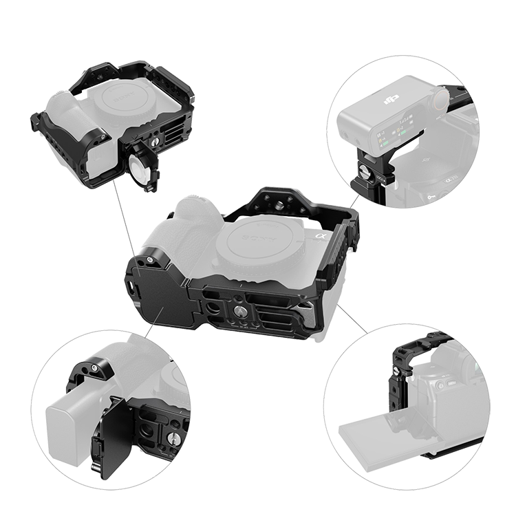 Профессиональная клетка для Sony a7R V/a7 IV/a7S IIIa/a1/a7R IV/a7 V, защищающая ее корпус от механических повреждений в условиях интенсивной эксплуатации. Она не ограничивает доступ ко всем портам и кнопкам, а откидная боковая панель значительно упрощает процедуру замены аккумулятора. Легкая, но прочная конструкция из алюминиевого сплава дополнена резиновыми накладками, которые предотвращают появление царапин на поверхности камеры