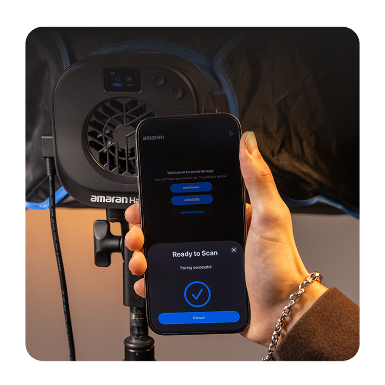 Удобное управлениеПроцесс настройки света максимально прост: отдельные ручки яркости и цветовой температуры позволяют работать без изучения меню. Достаточно поднести смартфон к корпусу и встроенный модуль NFC мгновенно подключает прибор к приложению amaran, даже если она выключена. Для профессиональных студий и стримов предусмотрена поддержка DMX-управления через Type-C (адаптер приобретается отдельно), что позволяет интегрировать Halo в единую сеть. В вашем распоряжении также 9 спецэффектов для создания динамичных сцен на видео |