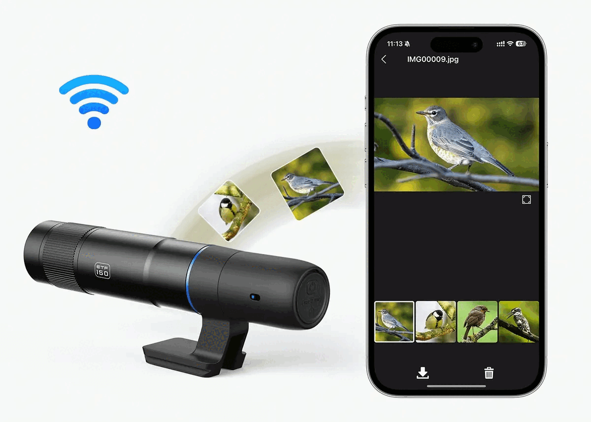 В основе аппарата лежит профессиональная оптическая система с фокусным расстоянием 150 мм и многослойным просветлением FMC, обеспечивающим 98% светопропускание и отсутствие дисторсии. Это гарантирует детализированное изображение даже в условиях слабого освещения. Монокуляр оснащен встроенным модулем Wi-Fi, который через фирменное приложение APVision превращает ваш смартфон в дистанционный пульт управления с радиусом действия до 10 метров. С него можно в реальном времени просматривать трансляцию в Full HD (1080p), делать фото, записывать видео с частотой 30 кадров/с и мгновенно делиться материалами, сохраняя данные одновременно на карту памяти TF и в память телефона