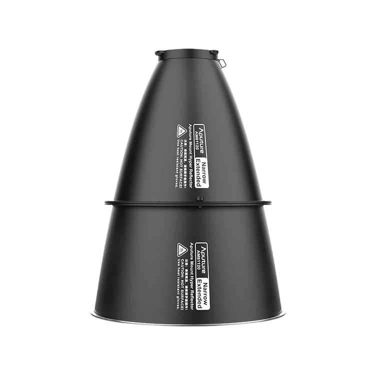 Широкоугольный рефлектор диаметром 262 мм создает равномерный мягкий свет с широким охватом, идеально подходящий для общего заполняющего освещения. Узкоугольная модель диаметром 475 мм фокусирует световой поток, обеспечивая интенсивный и направленный луч для акцентной подсветки или создания драматичных эффектов. Уникальная возможность — комбинация узкоугольного отражателя с удлинителем для получения сверхузкого пучка 20°, который позволяет создавать четкие световые пятна и работать на больших дистанциях. Конструкция с креплением Aputure-mount обеспечивает быструю смену рефлекторов без инструментов, сохраняя стабильность позиционирования
