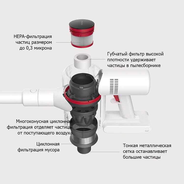Качественная система фильтрацииФильтрация в пылесосе проходит через 5 ступеней: HEPA-фильтр гарантирует удаление мелких частиц размером до 0,3 мкм, губчатый фильтр высокой плотности удерживает частицы в пылесборнике, многоконусная циклонная фильтрация отделяет частицы от поступающего воздуха, циклонная фильтрация мусора обеспечивает дополнительную обработку поступающего воздуха, а тонкая металлическая сетка останавливает большие частицы |