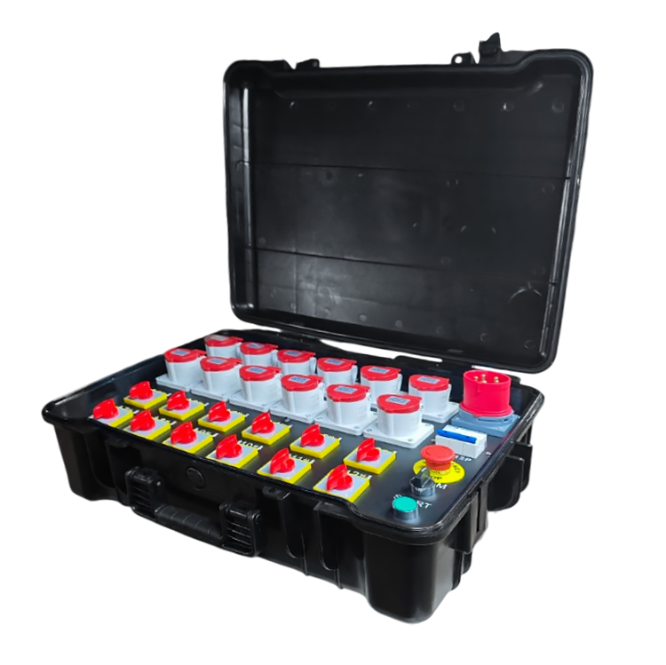Пульт управления лебедками Electric Hoist Controller KLT-12P на 12 каналов предназначен для централизованного управления электрическими лебедками на съемочных площадках и в студийных павильонах. Имеет четырехполюсный автомат на 32 ампера с возможностью подключения трехфазной сети 380 вольт, обеспечивающего питание каждого канала мощностью до 1,1 киловатта, а также возможность линкования нескольких пультов через трехполюсные разъемы XLR для расширения системы