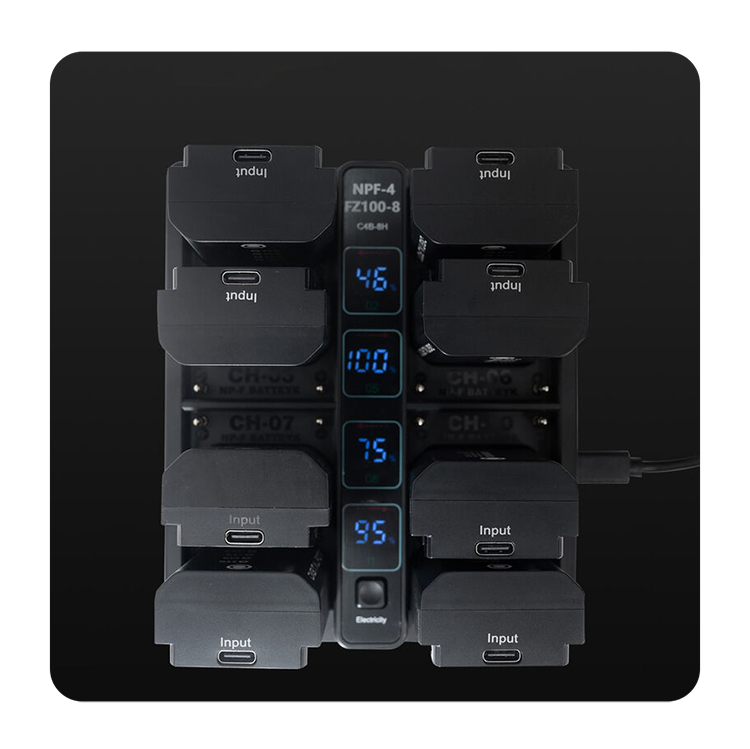 Уникальная зарядная станция с двумя уровнями слотов, благодаря чему вы сможете заряжать одновременно до 8 аккумуляторов NP-FZ100 или до 4 батарей стандарта NP-F (размер до NP-F970). Зарядные области находятся друг над другом, а значит вы сможете комбинировать количество элементов. 4 отдельных дисплея показывают статус зарядки, а общая мощность в 100 Вт по Type-C Power Delivery гарантирует быстрый процесс. Предусмотрены два режима работы: быстрая зарядка 23 Вт или безопасная - 5 Вт |