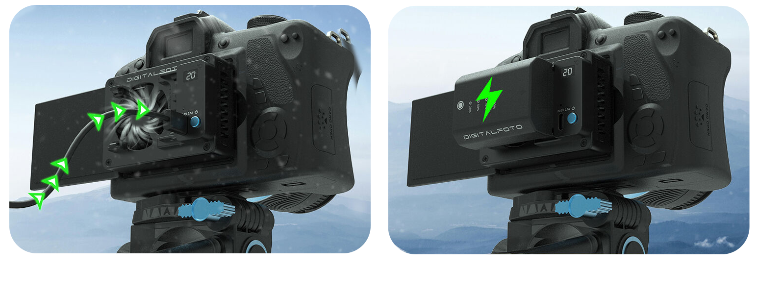 Без перегреваСистема охлаждения серии ICEMAN позволяет охлаждать камеру прямо во время съёмки исключая перегрев. Устанавливается прямо в слот откидного монитора, для максимального соприкосновения с корпусом. 12 лопастей турбро куллера обеспечивают мощный обдув, а корпус из алюминия гарантирует хороший теплоотвод |