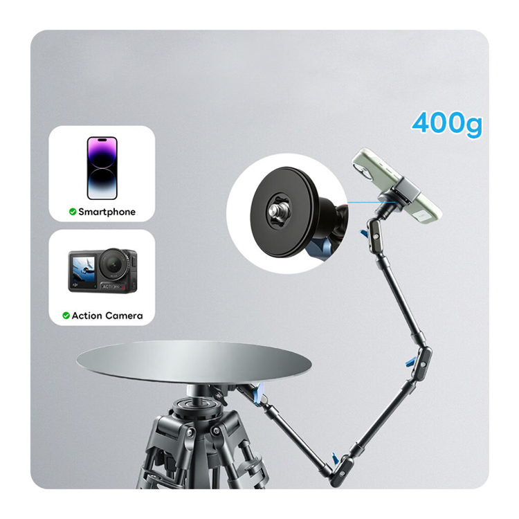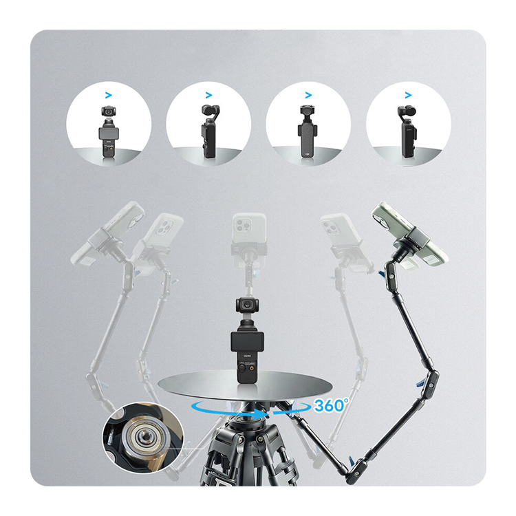 Устройство оснащено регулируемой "рукой" длиной 76 сантиметров с тремя шарнирами, обеспечивающей свободную регулировку угла наклона. Простая модульная конструкция позволяет собирать и разбирать систему за считанные минуты, экономя время при подготовке к съемке. Плюс к этому, кронштейн можно объединить с зажимом и установить на элементы окружения для статичной съёмки с необычного ракурса