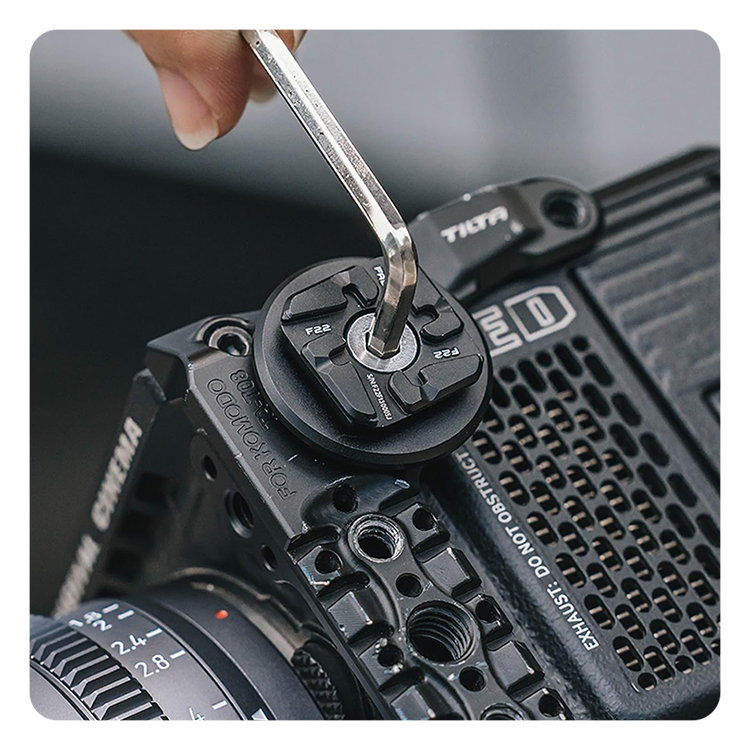 Быстросъемная площадка объединяет крепление типа ARRI Rosette с экосистемой F22. Конструкция из алюминиевого сплава с винтом M6 минимизирует люфт при работе с тяжелым оборудованием. Совместимость с креплением ARRI позволяет использовать площадку с раличными ригами, которые можно будет отрегулировать под нужным углом