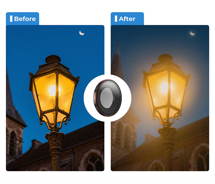 Для художественной съемки предназначен фильтр Glow Black Mist 1/4, создающий мягкое свечение вокруг источников света и смягчающий контрасты. Ультрафиолетовый UV-фильтр выполняет защитную функцию, оберегая объектив от царапин, пыли и влаги, одновременно нейтрализуя дымку. Все фильтры изготовлены из оптического стекла с многослойным просветляющим покрытием, обеспечивающим максимальную светопропускаемость и цветовую точность