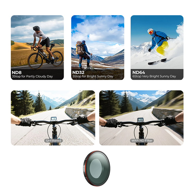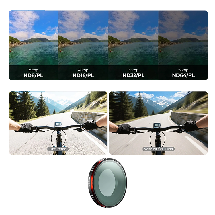 Коллекция светофильтров Freewell для Insta360 GO Ultra даёт возможность улучшить качество съёмки, преображая кадр профессиональными решениями. Серия включает ND фильтры различной плотности для точного управления экспозицией. Такой фильтр уменьшает количество поступающего света, позволяя создавать естественное motion blur даже при ярком солнечном свете. Комбинированные модели ND/PL дополнительно устраняют блики и повышают насыщенность цветов благодаря встроенной круговой поляризации