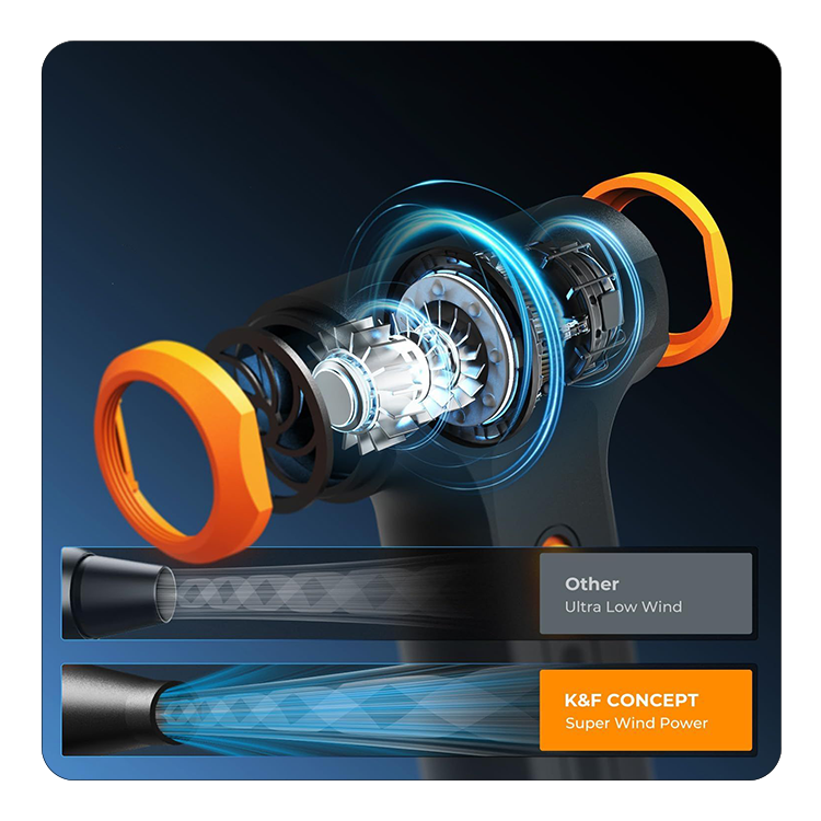 Корпус из ударопрочного ABS-пластика обеспечивает защиту при активном использовании. Встроенный аккумулятор поддерживает до 120 минут работы на низкой скорости, а разъем Type-C с быстрой зарядкой 10 Вт позволяет питать устройство. Плавная регулировка мощности позволяет регулировать интенсивность воздушного потока для различных условий и поставленных задач