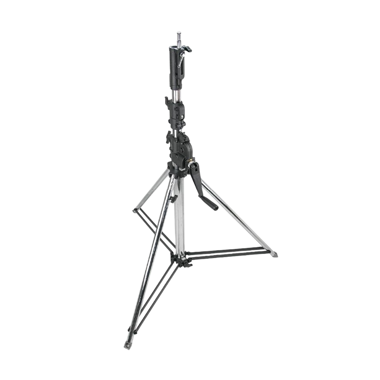 Стойка KUPO 483BT оснащена трехсекционной телескопической конструкцией с механическим подъемным механизмом, обеспечивающим плавное изменение высоты от 172.5 до 380 см с точностью позиционирования 4.4 см за оборот рукоятки. Хромированные стальные колонны диаметром 55/45/38 мм с металлическими locking-муфтами выдерживают нагрузку до 30 кг. Система автоматической блокировки и twin-распорки обеспечивают стабильность на неровных поверхностях благодаря регулируемой опорной ноге