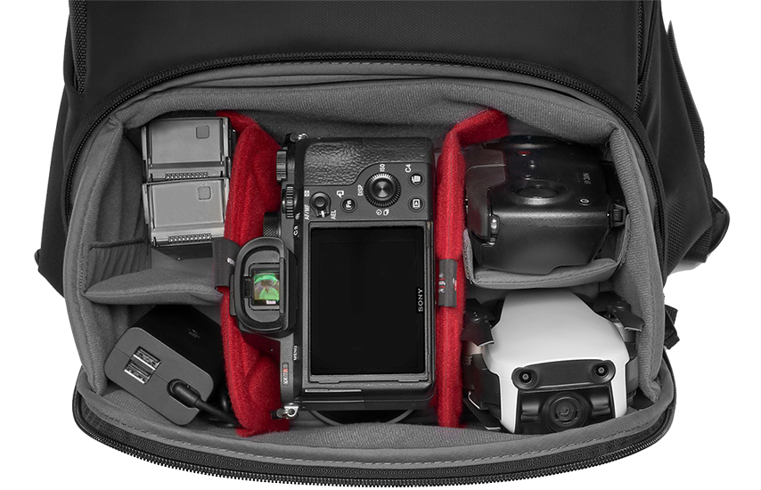 Внутреннее пространство рюкзака можно настроить регулируемым разделителям органайзера, что обеспечивает безопасность для хрупкой техники во время транспортировки. Для личных вещей предусмотрен отдельный просторный отсек, а также плоские карманы для ноутбука для 14" и планшета до 9.7". Снаружи присутствует крепление для складного штатива