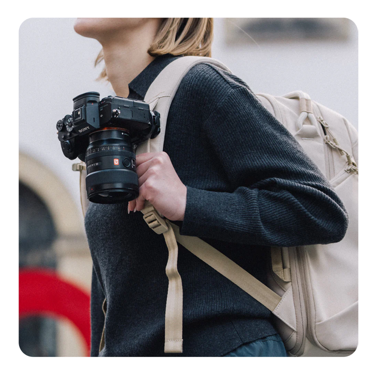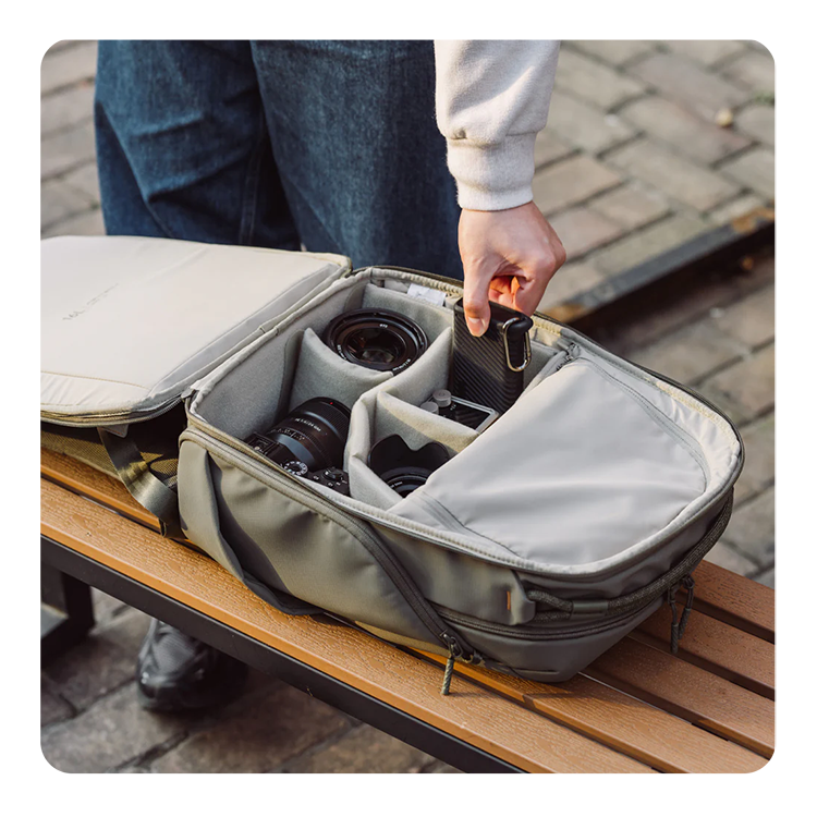Рюкзак PGYTECH OneGo Lite оснащен съемными амортизирующими отделениями: нижний блок для фототехники вмещает системную камеру с тремя объективами, а верхний сектор предназначен для личных вещей. Специализированные карманы включают магнитный отсек для 14-дюймового ноутбука, изолированные отделения для аккумуляторов и скрытый карман для AirTag. Система креплений на плечевых лямках и регулируемые разделители обеспечивают гибкую организацию внутреннего пространства