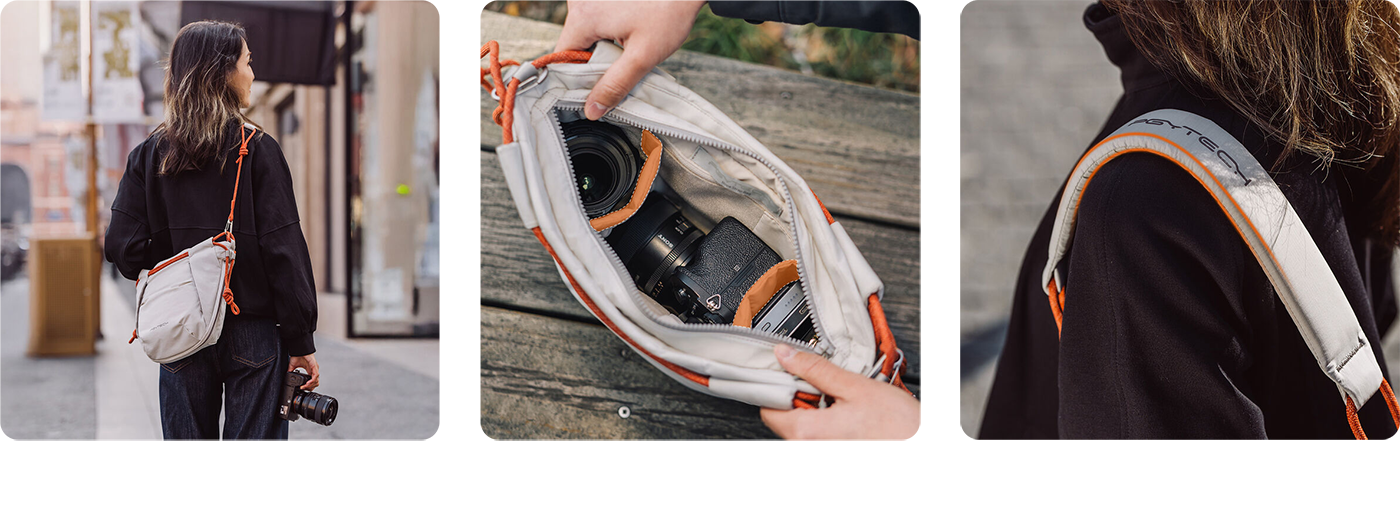Лёгкая сумка OneGo Rope Strap весом всего 370 грамм предлагает четыре способа переноски: через плечо, кросс-боди, подмышкой и в ручном режиме. Регулируемый и съемный ремень шириной 50 миллиметров с анатомической формой обеспечивает комфорт при длительном использовании. Многофункциональные точки крепления позволяют фиксировать аксессуары — от ключей до гаджетов
