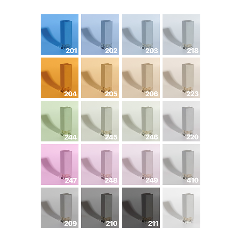 В наборе представлены цветные конверсионные фолиевые/гелевые фильтры с различными коэффициентами понижения: от 1/8 до 2 ступеней. Это дает возможность точно настроить освещение под конкретные задачи и условия съемки.