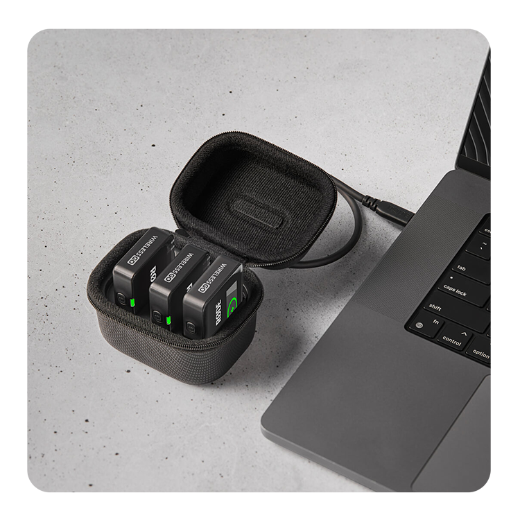 Зарядный кейс для одновременной зарядки двух передатчиков одного приёмника Wireless GO (Gen 3) или Wireless PRO. Подключается к сети посредством одного Type-C кабеля. Благодаря встроенному аккумулятору вы можете заряжать устройства в дороге, ведь его хватит на два цикла зарядки (всего 21 час). Кроме того, зарядный кейс можно использовать для доступа к записи и обновления прошивки всех устройств одновременно