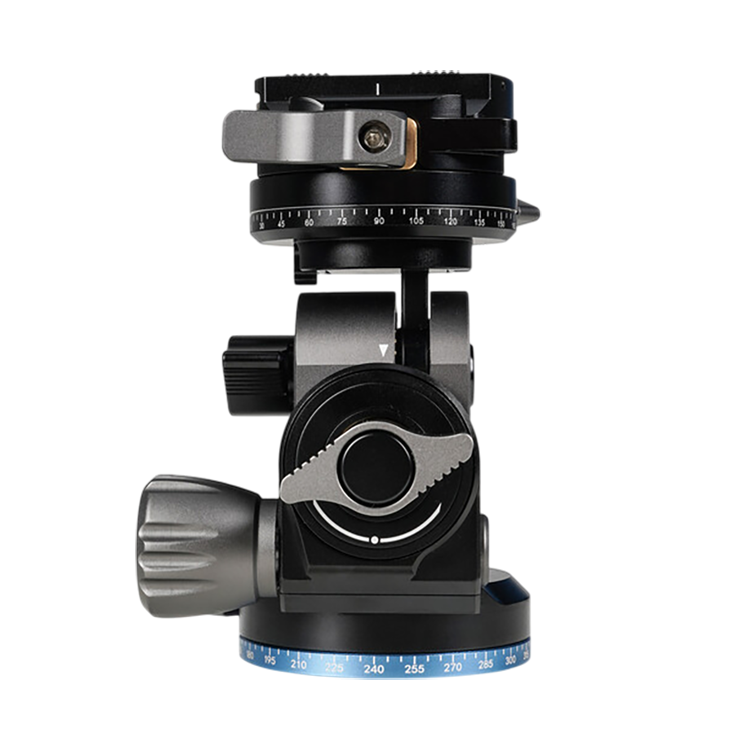 Головка оснащена быстросъемной площадкой Arca Swiss с боковой загрузкой и фиксатором флип-лок. Два встроенных пузырьковых уровня обеспечивают точную ориентацию в пространстве. Эргономичные рукоятки с резиновыми накладками позволяют плавно регулировать положение по трем осям с фиксацией настроек. Нумерованные шкалы на поворотной базе и верхней пластине обеспечивают повторяемость параметров при многократных съемках