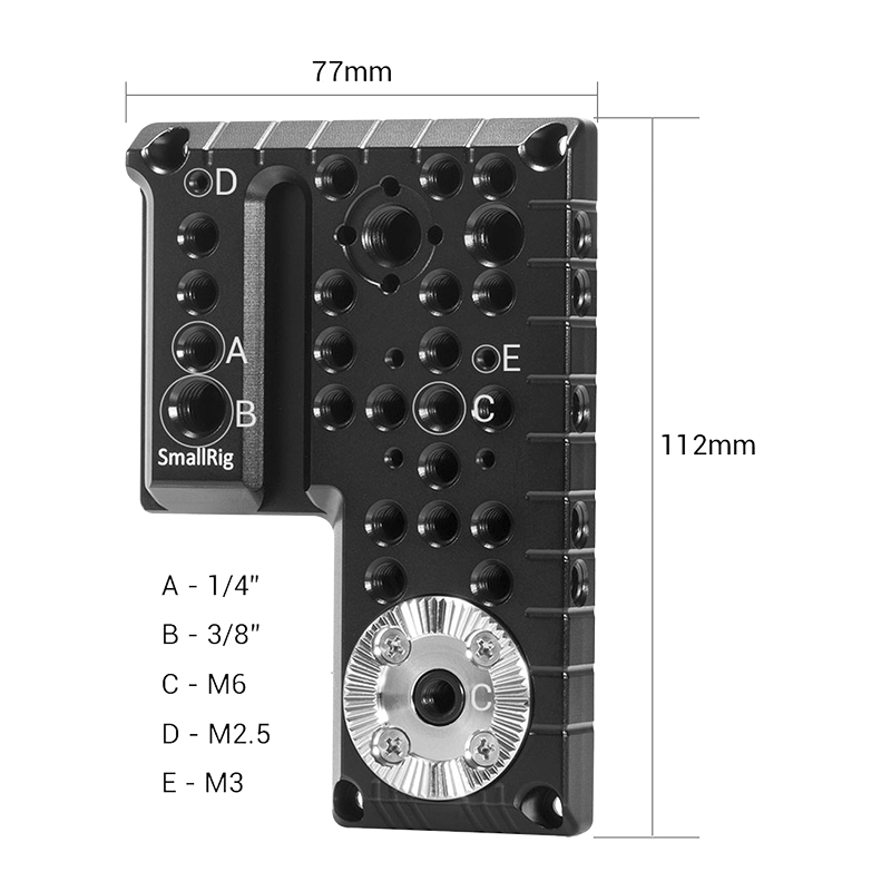 Правая боковая панель для работы с камерами. Представленный аксессуар крепится к устройству с помощью четырех винтов. Преимуществом модели является то, что она не перекрывает доступ к батарее, системным отсекам и другим портам. Крепление имеет отверстия 1/4", 3/8" и Arri для фиксации различных фотоаксессуаров
