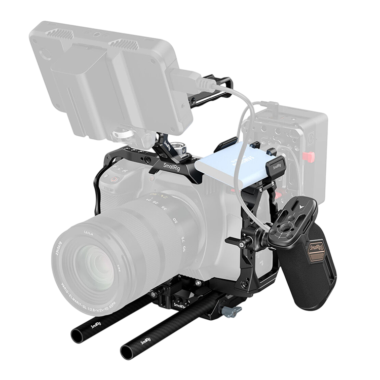 Расширенный комплект SmallRig превращает камеру Blackmagic Design Cinema 6K в полноценную съемочную систему, обеспечивая всестороннюю защиту корпуса и максимальную гибкость во время работы. Алюминиевая клетка с возможностью трансформации из полной в облегченную адаптируется под различные задачи — от минималистичного набора до оснащения тяжелой оптикой и аксессуарами. Система крепления с двумя винтами 1/4" в основании и одним на верхней панели надежно фиксирует камеру, а силиконовые накладки исключают проворот и появление царапин