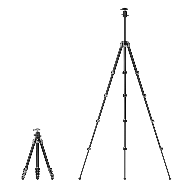 Штатив с ножками из 8-слойного карбона, что обеспечивает оптимальный баланс между прочностью и весом: конструкция весит всего 1,4 кг при максимальной нагрузке до 15 кг. Пятисекционные ноги с фиксаторами, плотно прилегающими к профилю секций, позволяют быстро разворачивать и складывать треногу. В сложенном состоянии длина составляет 47 см, что делает его удобным для транспортировки в сумке и идеальным вараинтом для путешествий