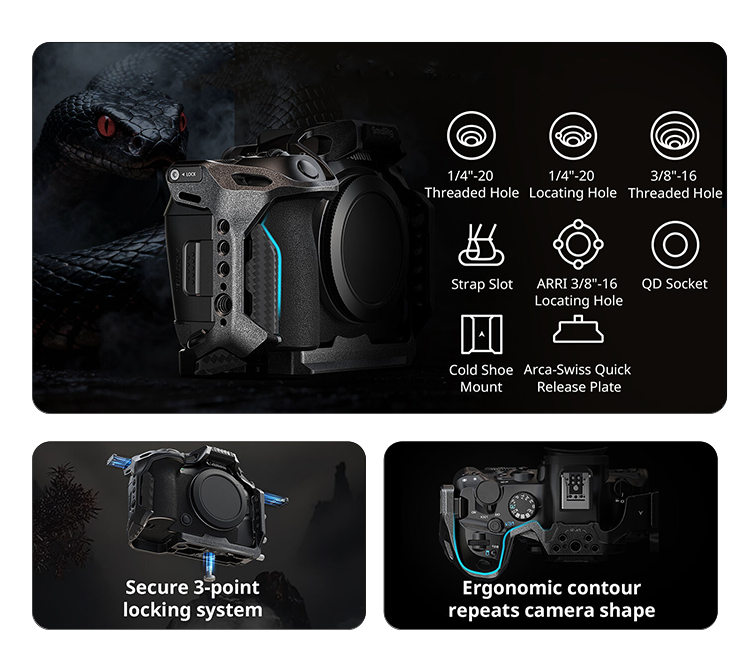 Облегченная конструкция - повышенная функциональностьКлетка с облегченной конструкцией разработана для повышения эффективности и комфорта съёмки на камеру Canon EOS R6 Mark III, R6 Mark II или R5 Mark II. Конструкция из алюминия фиксируется штативным винтом, а резиновые вставки предотвращают появление царапин и сколов на корпусе. Все органы управления и слот аккумулятора остаются в свободном доступе |