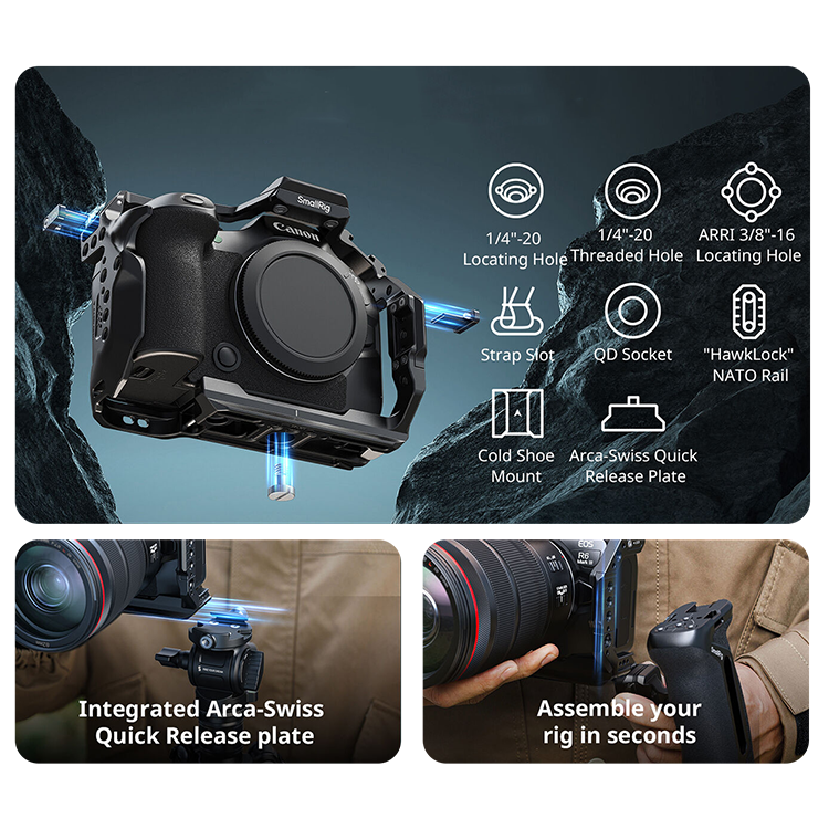 Клетка для беззеркальных камер CanonКлетка обеспечивает надежную защиту корпуса беззеркальной камеры Canon EOS R6 Mark III или R6 Mark II, сохраняя доступ ко всем органам управления, батарейному отсеку и даже штатному горячему башмаку. Фиксация осуществляется с помощью винта 1/4" и двух боковых направляющих блоков, исключающих проворот даже при использовании тяжелой оптики. Встроенные силиконовые прокладки предотвращают появление царапин на корпусе, а продуманная геометрия не мешает замене аккумулятора и работе с картами памяти |
