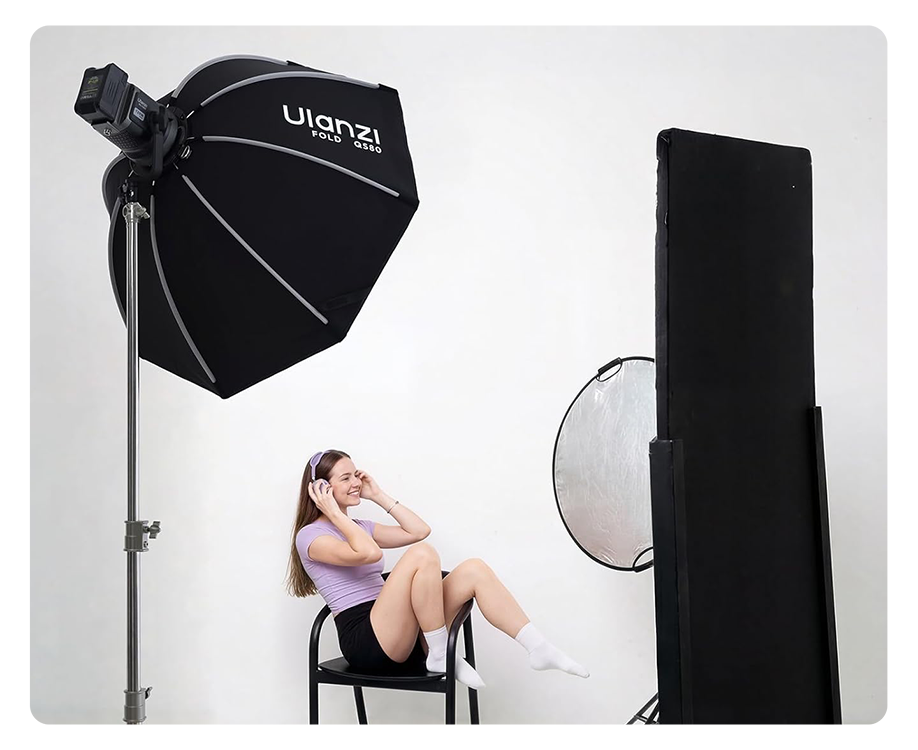 Софтбокс Ulanzi QS80 создан для профессиональной портретной съемки, рекламных роликов и предметной видеографии, обеспечивая мягкое и естественное освещение объектов на расстоянии 2-3 метров. Главная особенность серии FOLD в складной конструкции кольца-основания с быстрым механизмом раскрытия, позволяющая за секунды перейти к съемке без использования дополнительных инструментов. Промышленная ткань рассеивателя с креплением на липучках обеспечивает высокое качество светопередачи и долговечность