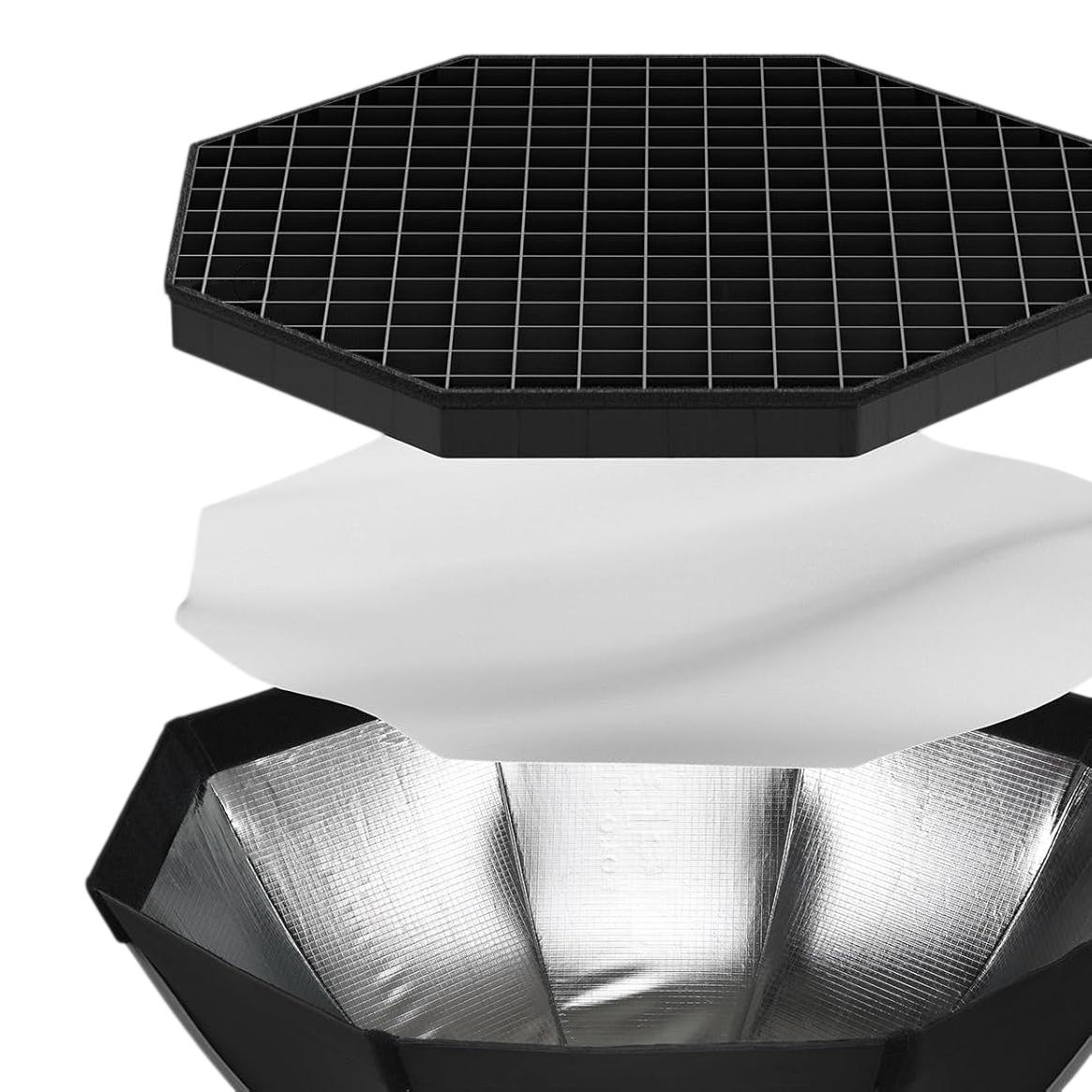 Насадка оснащена съёмным байонетом Bowens, совместимым с большинством студийных осветителей на рынке. В сложенном состоянии софтбокс имеет габариты 80 на 25 см и весит всего 650 г, что делает его идеальным спутником для выездных проектов. Параболическая форма и возможность точного контроля светового потока превращают этот модификатор в универсальный инструмент, сочетающий легкость транспортировки с профессиональным качеством света