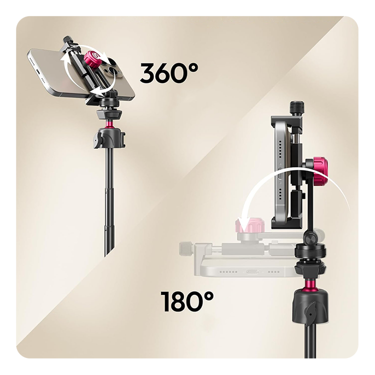 Гибкая настройка и совместимость Шарнирный механизм обеспечивает полное вращение на 360° и наклон до 180° с фиксацией в основных положениях, включая угол 90° для съемки сверху. Система быстрой регулировки Quick-Adjust позволяет мгновенно изменять размер захвата без использования инструментов. Совместимость с большинством смартфонов, включая линейки iPhone и Samsung Galaxy, делает держатель идеальным решением для видеоблогинга, стриминга и профессиональной фотосъемки