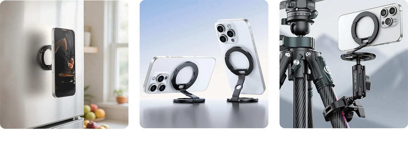 Держатель Ulanzi MA02 MagLock имеет сразу два магнитных кольца MagSafe, что позволяет не только устанавливать смартфон, но и различные совместимые аксессуары без дополнительных приспособлений. Вы сможете использовать его как подставку, или закрепить на металлической поверхности для съёмки с необычного ракурса. Поставить магнитный осветитель и настроить нужное положение теперь проще простого!