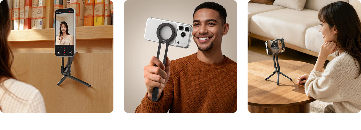 Мобильный штатив Ulanzi MA57 создан для влогеров, путешественников и создателей контента, которым нужна максимальная универсальность в минимальном форм-факторе. Целых четыре сценрария работы в одном устройстве: устойчивый настольный штатив, удобная селфи палка, компактная рукоятка для съемки с рук и режим «Mantis» для подвешивания на любые поверхности. Тренога с тремя точками опоры и противоскользящими силиконовыми накладками гарантирует стабильность без вибраций, а быстрая трансформация между режимами занимает секунды
