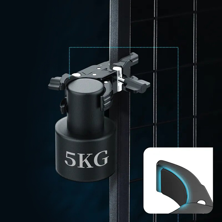 Зажим округлой формы способен захватить трубу до 48мм, а второй рассчитан на прямоугольные в сечении конструкции 25 x 25 мм. Выполнен из прочного алюминия с силиконовыми вставками предотвращающими скольжение |