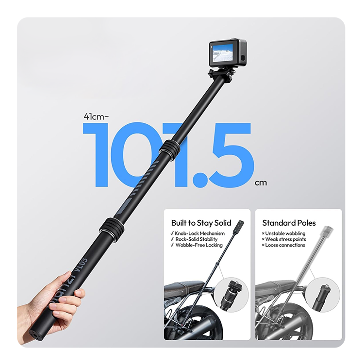 Регулируемая длина и универсальность Прочная алюминиевая штанга регулируется до трех положений: 41, 70 или 101,5 сантиметра, обеспечивая гибкий контроль над ракурсом съемки. При необходимости система разделяется на отдельную селфи-палку и устойчивую рукоятку, открывая новые творческие возможности. Быстросъемная площадка Hummingbird с механизмом скольжения и нажатия позволяет за секунды установить или снять камеру без долгого скручивания. Подходит для моделей с винтовым креплением 1/4" или классическим адаптером, как у GoPro