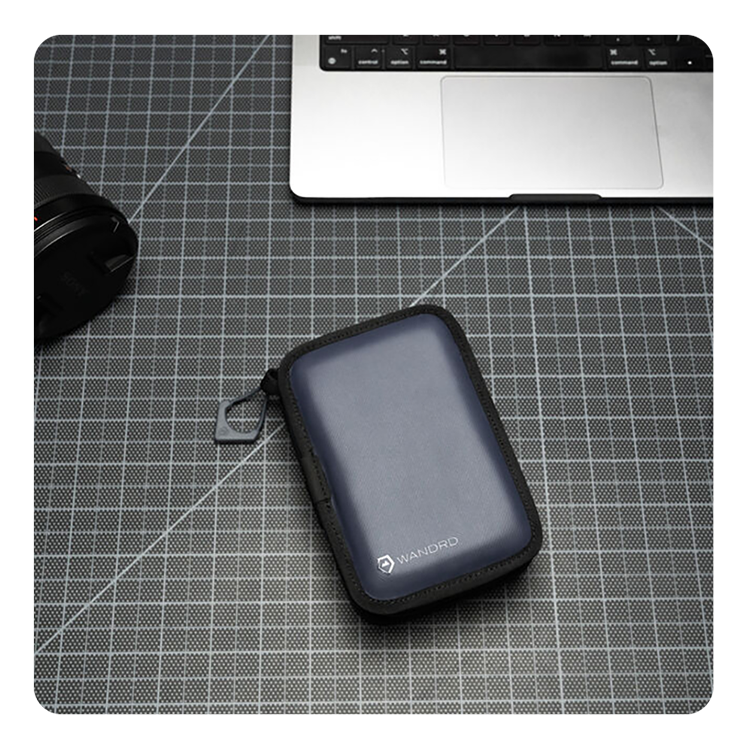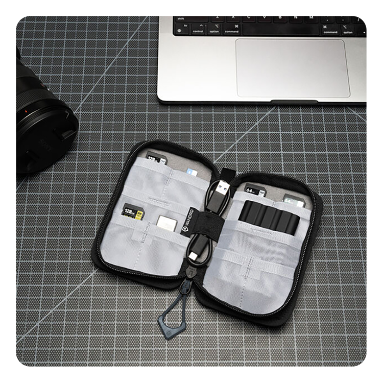 Кейс от WANDRD предлагает продуманную систему хранения для цифровых носителей. Внутреннее пространство включает восемь специализированных карманов для карт памяти формата SD и два отдельных отделения для портативных SSD-накопителей. Эластичный держатель с Сord keeper обеспечивает аккуратное размещение кабелей и дополнительных аксессуаров. Четырехсторонняя растягивающаяся сетчатая ткань внутренних карманов гарантирует безопасную фиксацию носителей любого размера, а мягкое внутреннее покрытие защищает от микроповреждений и царапин