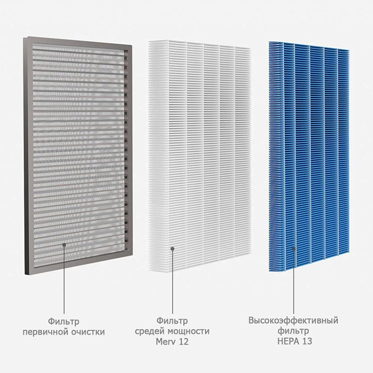 Трехступенчатая очистка воздухаЗа надежную очистку воздуха отвечает специальная трёхуровневая система фильтрации. Сначала поступающий воздух проходит через фильтр первичной очистки, задерживающий пух, крупные частицы пыли, насекомых, семена растений. Затем следует обработка фильтром Merv12, который блокирует поступление пыльцы, спор, более мелких семян и патогенных микроорганизмов. Последней ступенью очитки будет прохождение воздуха через фильтр HEPA13, необходимого для задерживания тяжелых металлов, формальдегидов и прочих наиболее мелких частиц. Скорость фильтрации воздуха составляет 220 кубометров в час |