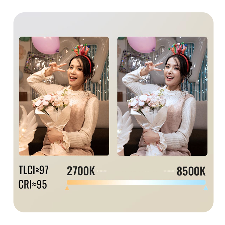 Точная цветопередача и гибкая настройкаДиапазон регулировки цветовой температуры от 2700 до 8500 К с индексом цветопередачи CRI 95+ и TLCI не менее 97, гарантируя естественное воспроизведение тона кожи и органичное смешение с окружающим светом. Устройство формирует аккуратное круглое световое пятно с ровным мягким краем без бликов благодаря продуманной оптике. Специальная рукоятка обеспечивает раздельное интуитивное управление яркостью и оттенком, позволяя новичкам быстро освоиться и точно настраивать параметры под любую сцену |